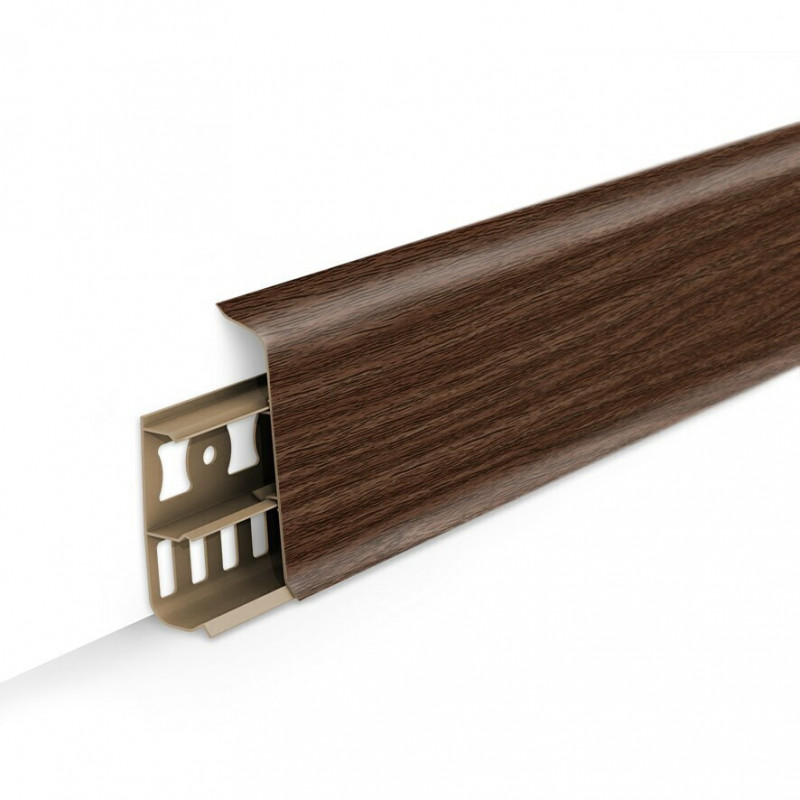 Стильная и функциональная форма профиля, удовлетворит утонченный вкус каждого покупателя. Благодаря простоте и элегантности, профиль пользуется огромной популярностью среди всемирных декораторов. Главные преимущества напольного плинтуса Открываешь, закрываешь и готово. Запатентованная уникальная конструкция позволяет монтировать и демонтировать плинтус без использования инструментов Больше места для размещения электропроводки. Существует возможность размещения большого количества проводов, в том числе после монтажа. Размещение дополнительной проводки возможно без использования инструментов. Покраска стен и оклеивание обоями без демонтажа. Благодаря простому снятию верхней части плинтуса, нет необходимости полного демонтажа плинтуса во время покраски стен или оклеивании стен обоями Маскировка электро и телевизионной проводки. Уникальная конструкция плинтуса даёт возможность раздельного размещения проводки. Сепаратор проводов внутри нашего плинтуса это важное преимущество нашей системы съемная панель. Провода напряжения нарушают передаваемый сигнал антенными проводами. Это имеет значительное влияние на качество изображения на экране или во время прослушивания музыки. Практически незаметное соединение всех элементов плинтуса. Благодаря современной технологии и высокому качеству производства плинтуса соединение элементов практически незаметно. Специальная двухслойная технология Плинтус, помимо слоя краски, дополнительно покрывается специальным лаком, благодаря чему его покрытие становится однородным, а это даёт возможность подобрать цвет плинтуса под цвет ламината, а кроме того это дополнительно защищает изделие от разного вида механических повреждений и вредного воздействия лучей УФ Эластичность плинтуса идеальное прилегание Благодаря эластичному материалу, плинтус идеально прилегает даже к неровностям стен и полов.